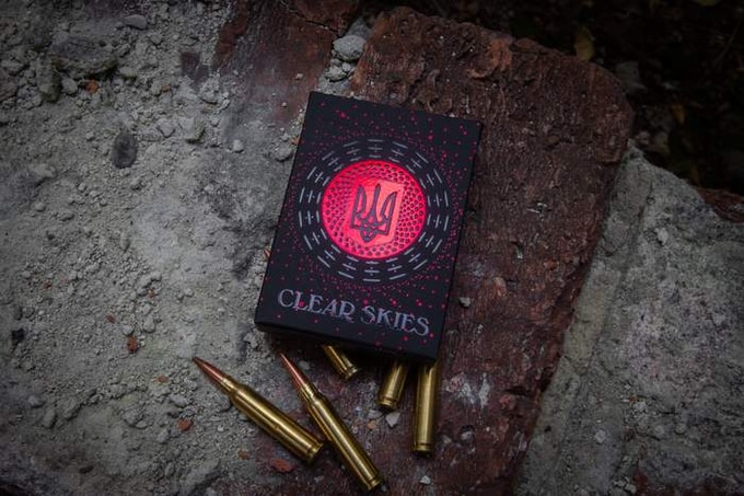 Continues the Clear Skies project with a bold black?and?red palette symbolizing resistance. Printed in Ukraine by NPCC. Visit Kickstarter project page for more information https://www.kickstarter.com/projects/newdawndecks/clear-skies-resistance-playing-cards