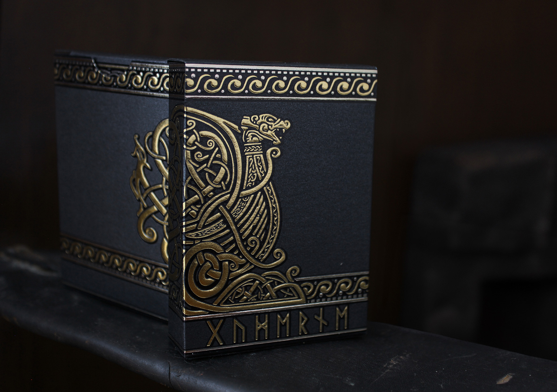 The 2023 remaster of the NORSE deck. Luxurious tuck with embossed art and three metal foils, limited run with numbered seals, metallic inks on cards. Visit Kickstarter project page for more information https://www.kickstarter.com/projects/designimperator/ragnarok-playing-cards-remastered/description