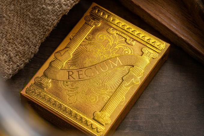 From REGIUM: King?s Treasure. Heirloom?s tuck uses gold and copper foils with embossing on gold cardstock. Backs combine matte gold and matte copper foils, faces use golden metallic ink for a vintage heirloom look. Visit Kickstarter project page for more information https://www.kickstarter.com/projects/1672116911/regium-kings-treasure-playing-cards