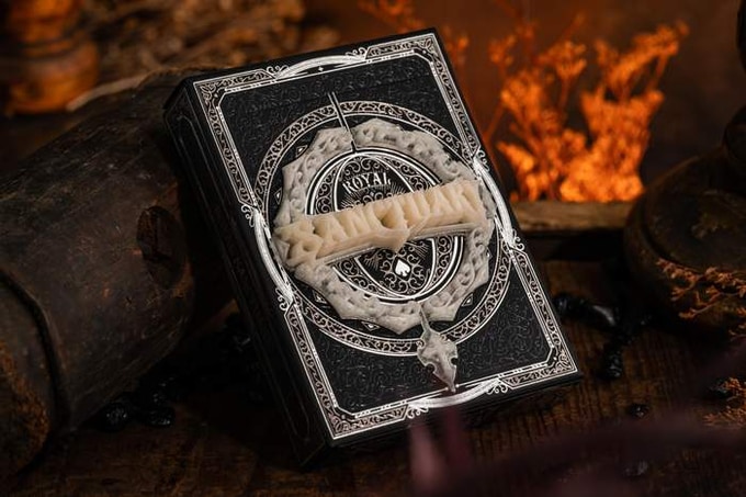 Obsidian represents Spirit. Matte black soft?touch stock with metallic prints in black, silver and dark silver, 3D relief with UV?reactive purple?blue glow, cards on black core with silver metallic ink and hidden UV details. Visit Kickstarter project page for more information https://www.kickstarter.com/projects/688605465/royal-sanctuary-elemental-chronicles-playing-cards